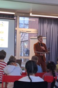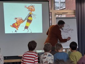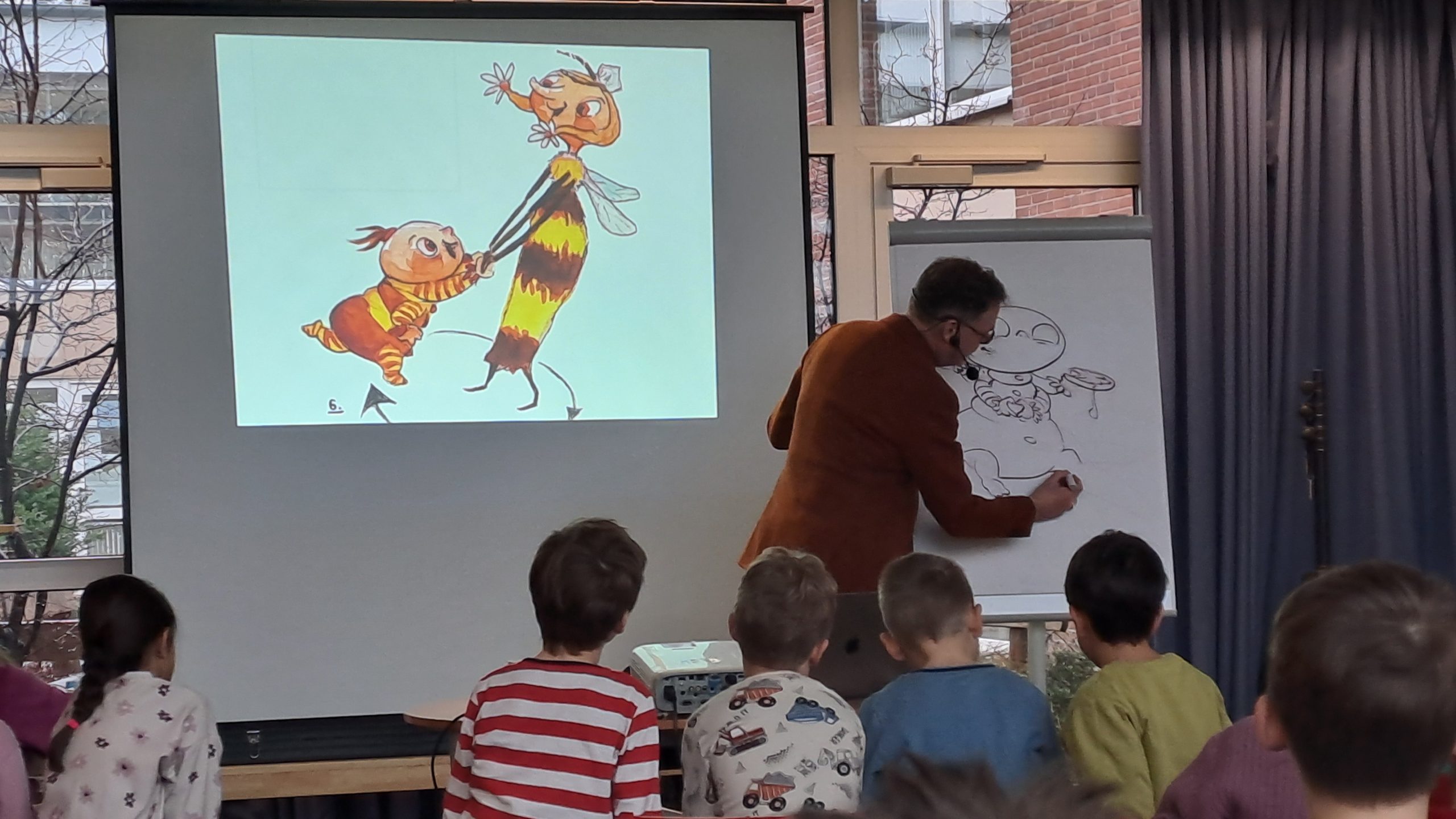 Für die Jahrgänge 2 bis 4 wurde es nicht weniger spannend: Sie hörten die Abenteuer von Spinne Karl-Heinz und Stubenfliege Busy. Die Kinder verfolgten die Geschichten mit großer Begeisterung, lachten an den richtigen Stellen und staunten über die Zeichnungen des Autors.